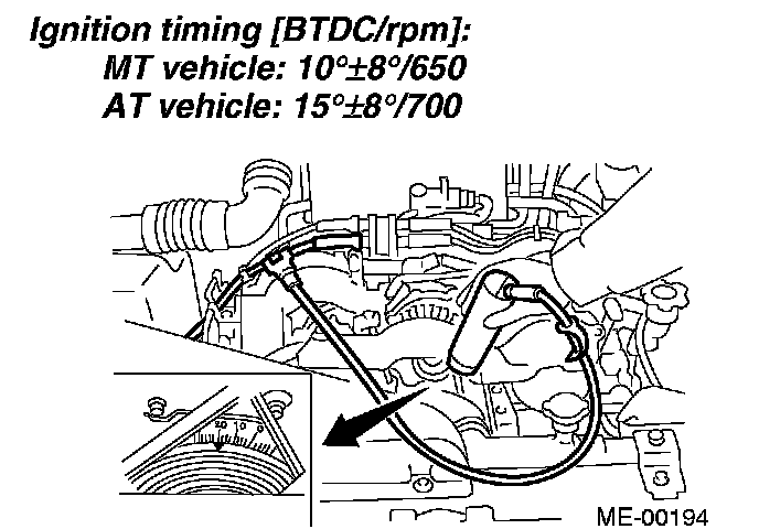 2. To check the ignition timing, connect a timing light to #1 cylinder spark plug cord, and illuminate the timing mark with the timing light.