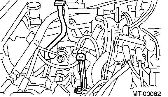 12. Remove the bolt which holds the right upper side of transmission to engine.