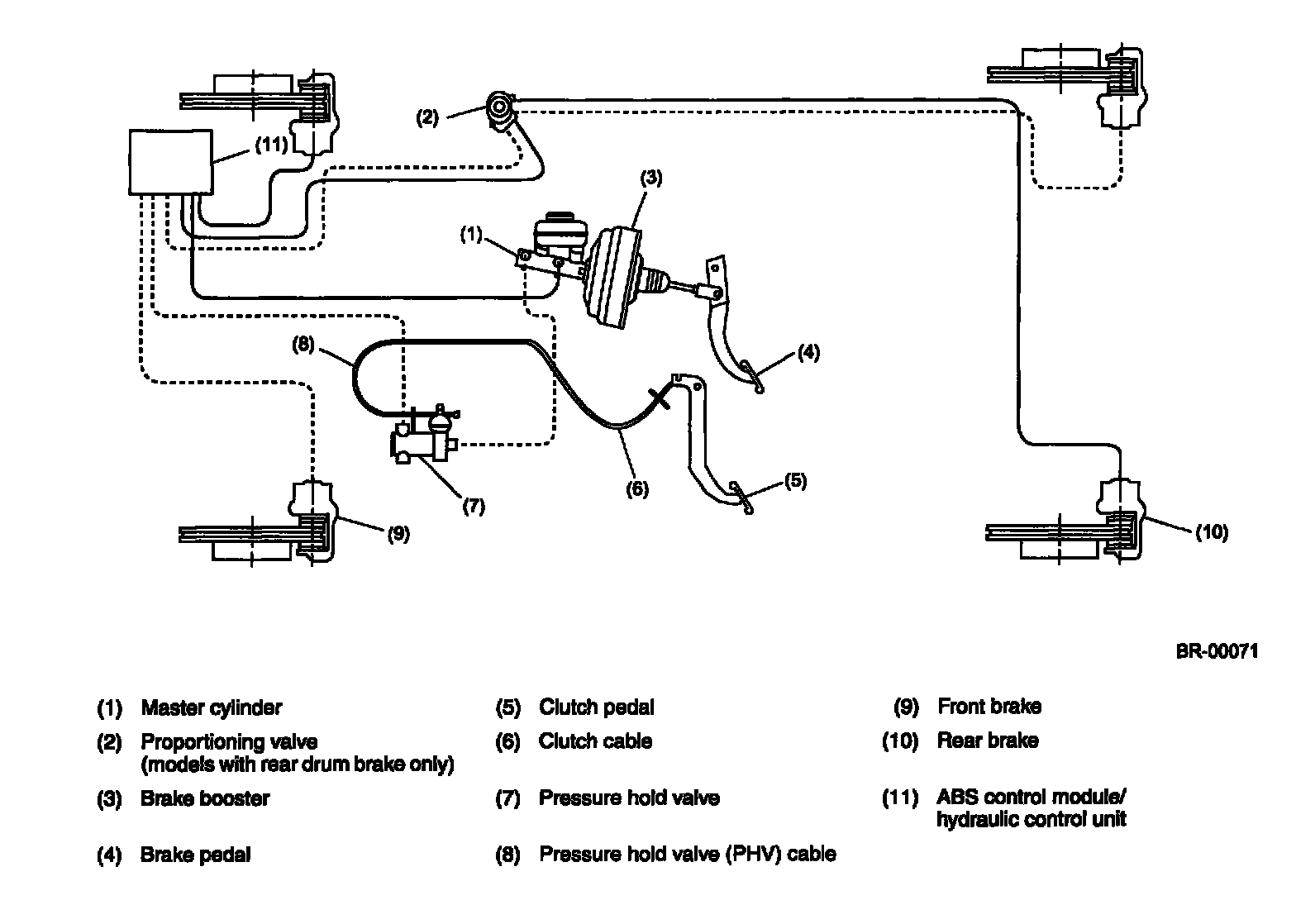 In this condition, the PHV's ball blocks the fluid passage back to the master cylinder and, therefore, the hydraulic pressure in the wheel cylinder circuits is maintained even after the brake pedal has been released as long as the clutch pedal is held depressed.
