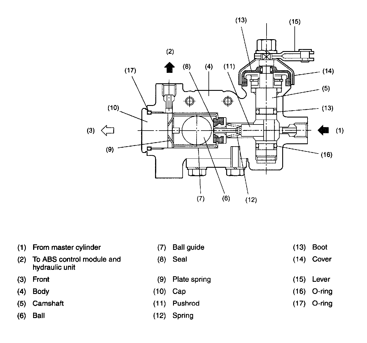 ^ The PHV is located on the piping that connects the master cylinder and the ABS control module/ hydraulic control unit. It has a camshaft which turns either way by rotation of the lever which is linked to the clutch pedal. The cam of the camshaft allows the pushrod in the PHV to move rightward (in the drawing below) under the force of a spring when the clutch pedal is depressed and pushes it leftward against the force of the spring when the clutch pedal is released. At the left of the pushrod, there is a ball housed in a chamber which has a seat for the ball. When the vehicle is on a level road, this ball stays at the left (front) of the chamber, but on an uphill road, it tends to move rightward by the gravity. In the latter case, the ball makes contact with the seat unless it is forced to leave the seat by a leftward movement of the pushrod (resulting from release of the clutch pedal).