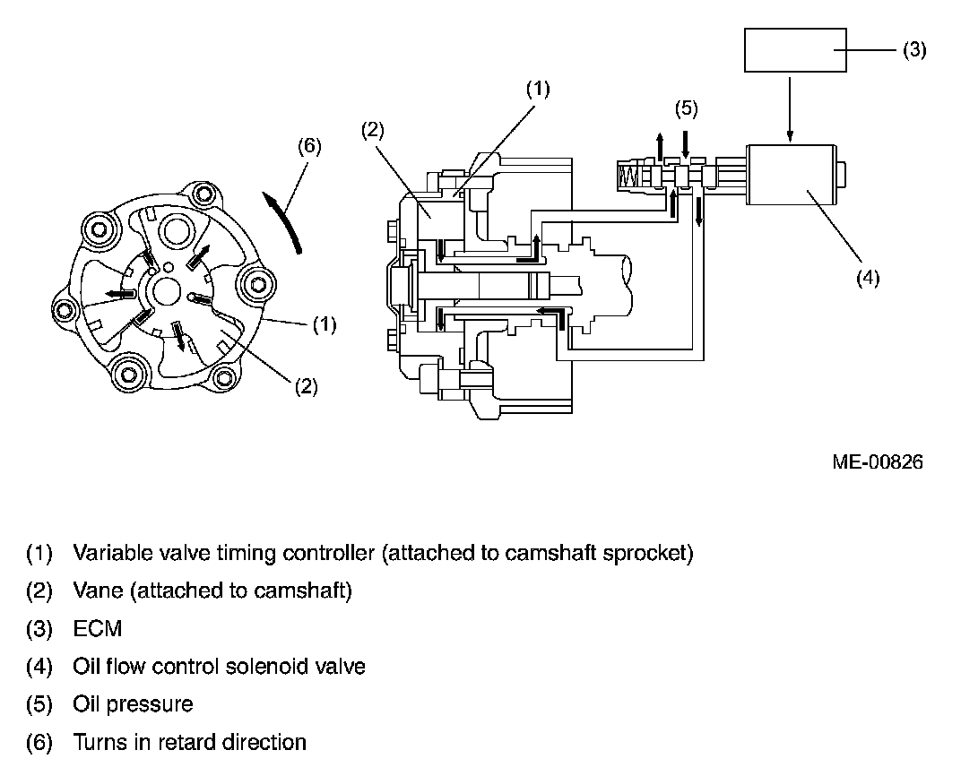 PHASE ANGLE RETARDSIn response to a retard signal from the ECM, the oil flow control solenoid valve moves its spool such that hydraulic pressure is applied to the retard chamber in the camshaft sprocket. The sprocket is then turned in the direction in which its phase angle retards relative to the camshaft.