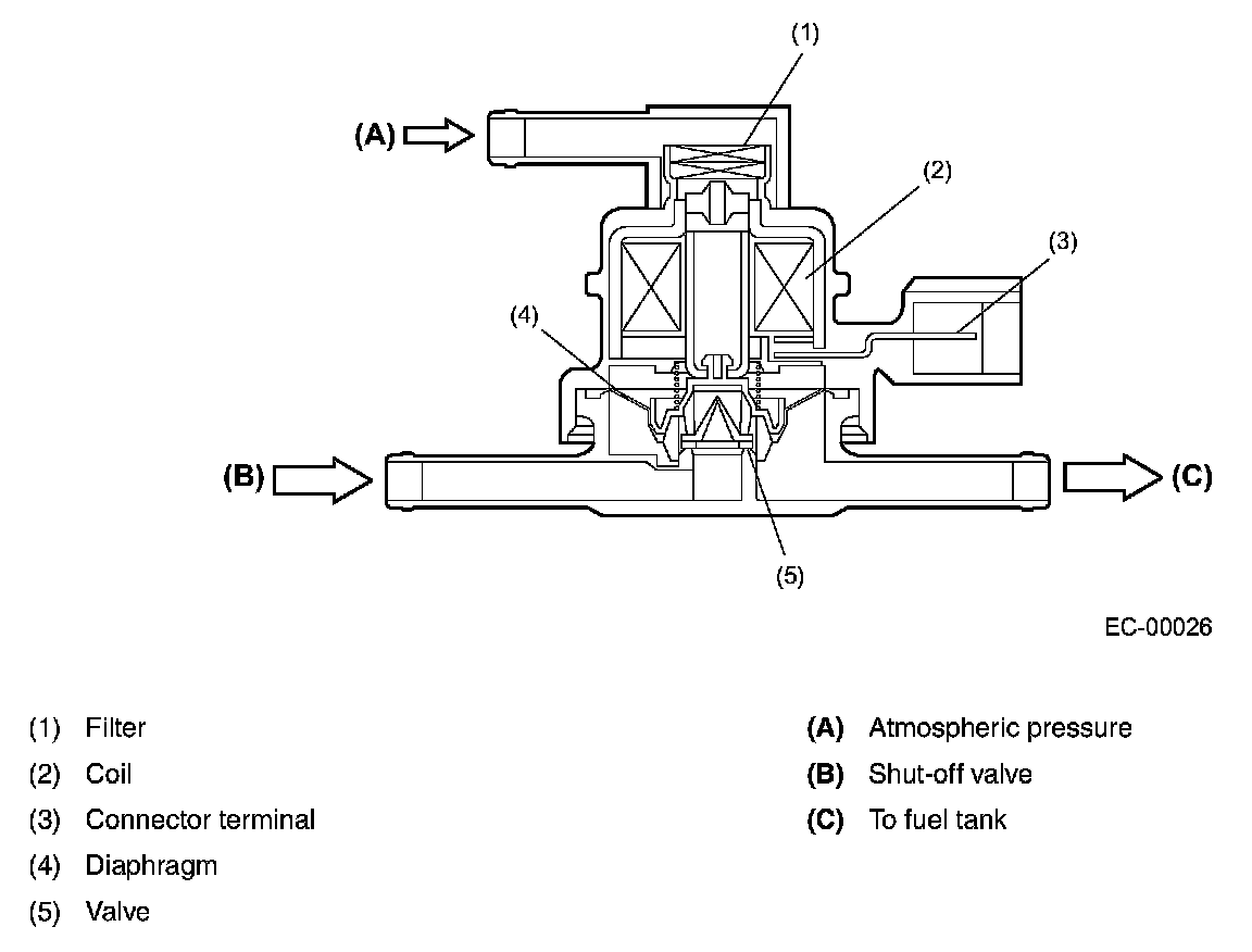 The fuel tank pressure control solenoid valve is located in the evaporation line between the canister and the fuel tank. It adjusts the fuel tank inside pressure under the control of the ECM.