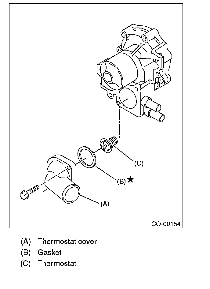 1. Install a gasket to thermostat, and install the thermostat and gasket to water pump as a unit. Then, install the thermostat cover.