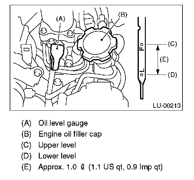 6. Just after driving or while the engine is warm, engine oil level shows in the range between "F line and cutout portion. This is caused by thermal expansion of engine oil.