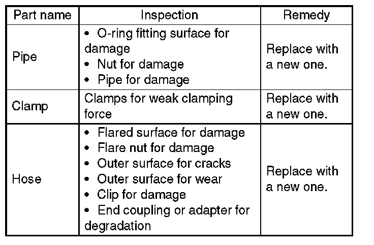 NOTE: It is likely that although one judges fluid leakage, there is actually no leakage. This is because the fluid spilt during the last maintenance was not completely wiped off. Be sure to wipe off spilt fluid thoroughly after maintenance.
