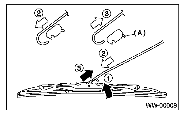 While pushing the locking clip (A) up, pull out the blade to the direction of the arrow and remove it from the wiper arm.