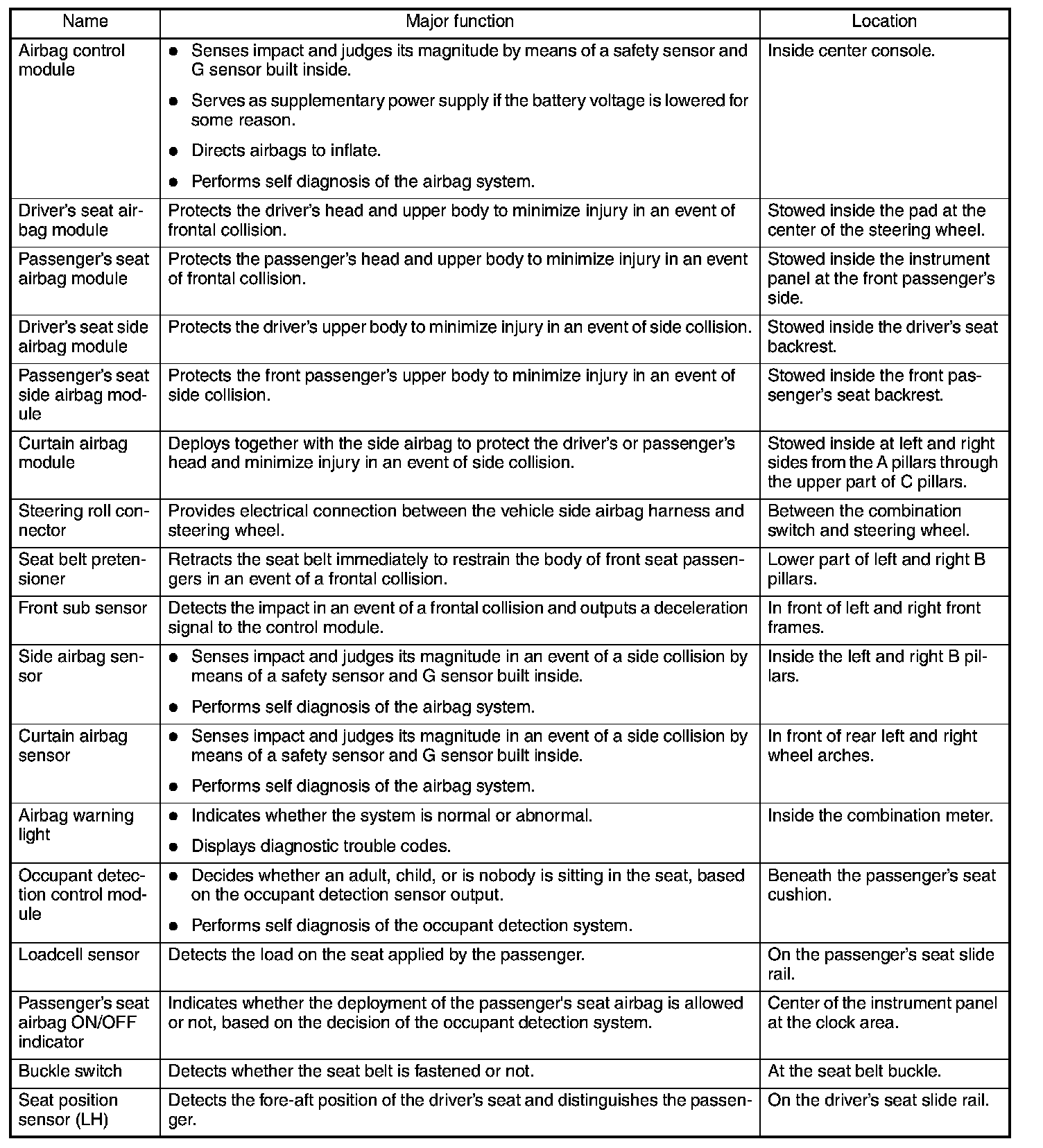 The control module receives electric signals from the safety sensor and electric sensor inside the module and also from the front sub sensor to detect the deceleration of the vehicle and judge whether the airbag and pretensioners should be ignited or not. It also has a self diagnosis function which lights up the airbag warning light in the combination meter if a fault occurs in the system. Diagnostic trouble codes generated by the self diagnosis function are stored in the memory in the module.