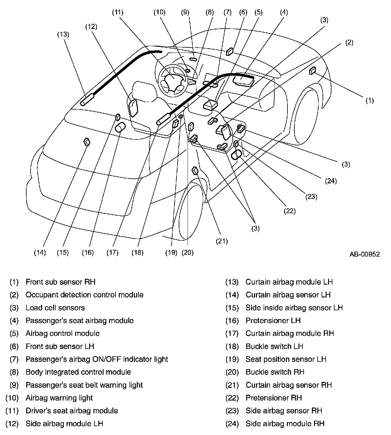 - Pretensioner and side airbag harnesses: integrated into the rear harness.