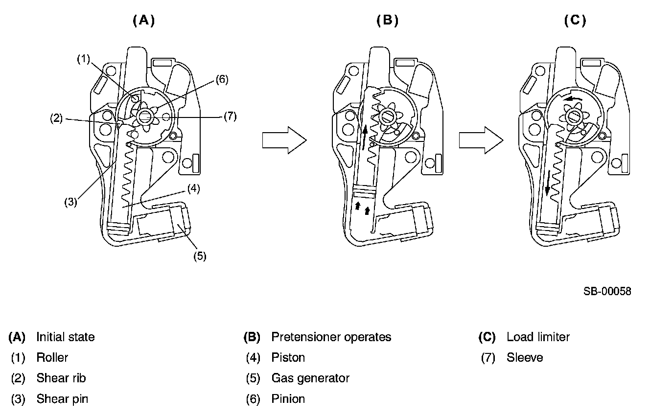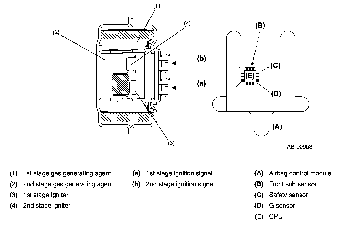 The airbag control module controls the operation of the seat belt pretensioner. If the front sub sensor and the sensors inside the airbag control module detect an impact exceeding a specified level, the driver's seat and front passenger's seat airbags are deployed almost simultaneously. Upon receiving signals from the airbag control module the gas generator inside the pretensioners are ignited and the gas pressure retracts the seat belts in a very short time to improve the passenger restraint effect.