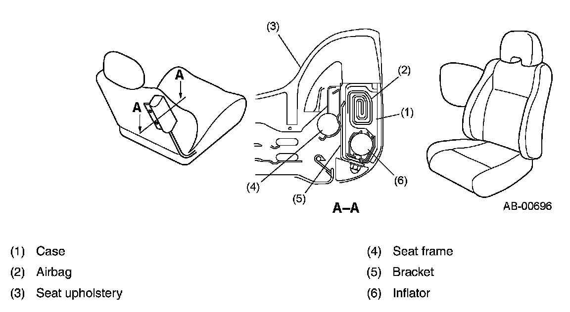 The SRS side airbag module assembly cannot be disassembled. The side airbag module is fixed to the seat frame with a bracket, and consists of an inflator, airbag, and a case.