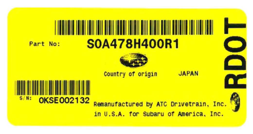Remanufactured short blocks can be easily identified due to a yellow label on the unit's bell housing. This label contains the part number and the remanufactured engine serial number.