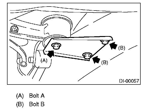 18) Remove the bolts which secure the front differential member to body. Loosen the bolt A first, then remove the bolts B.