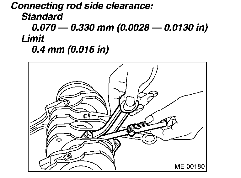 3. Install the connecting rod fitted with bearing to crankshaft, and then measure the side clearance (thrust clearance). Replace the connecting rod if the side clearance exceeds the specified limit.