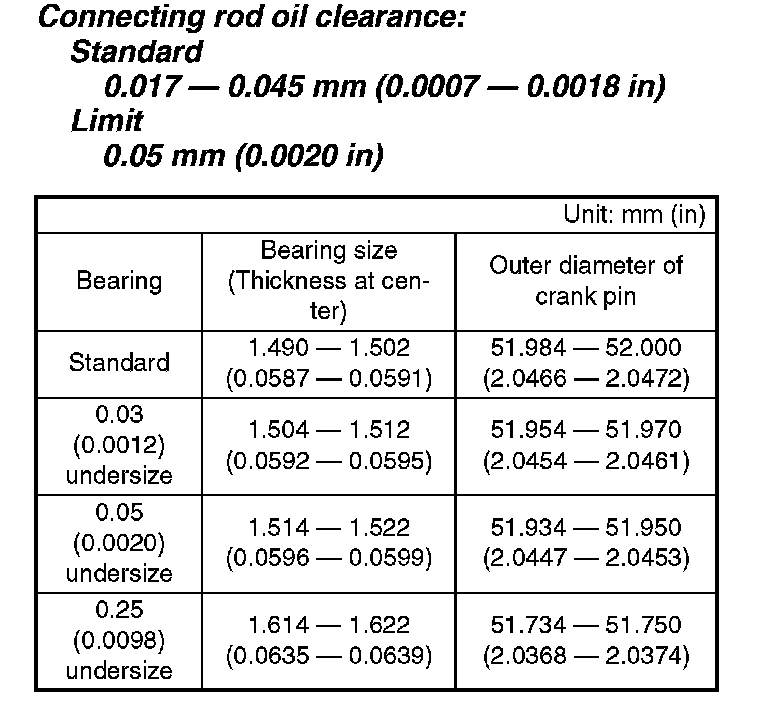 5. Measure the oil clearance on individual connecting rod bearings by means of plastigauge. If any oil clearance is not within the specification, replace the defective bearing with a new one of standard size or undersize as necessary. (See the table below.)