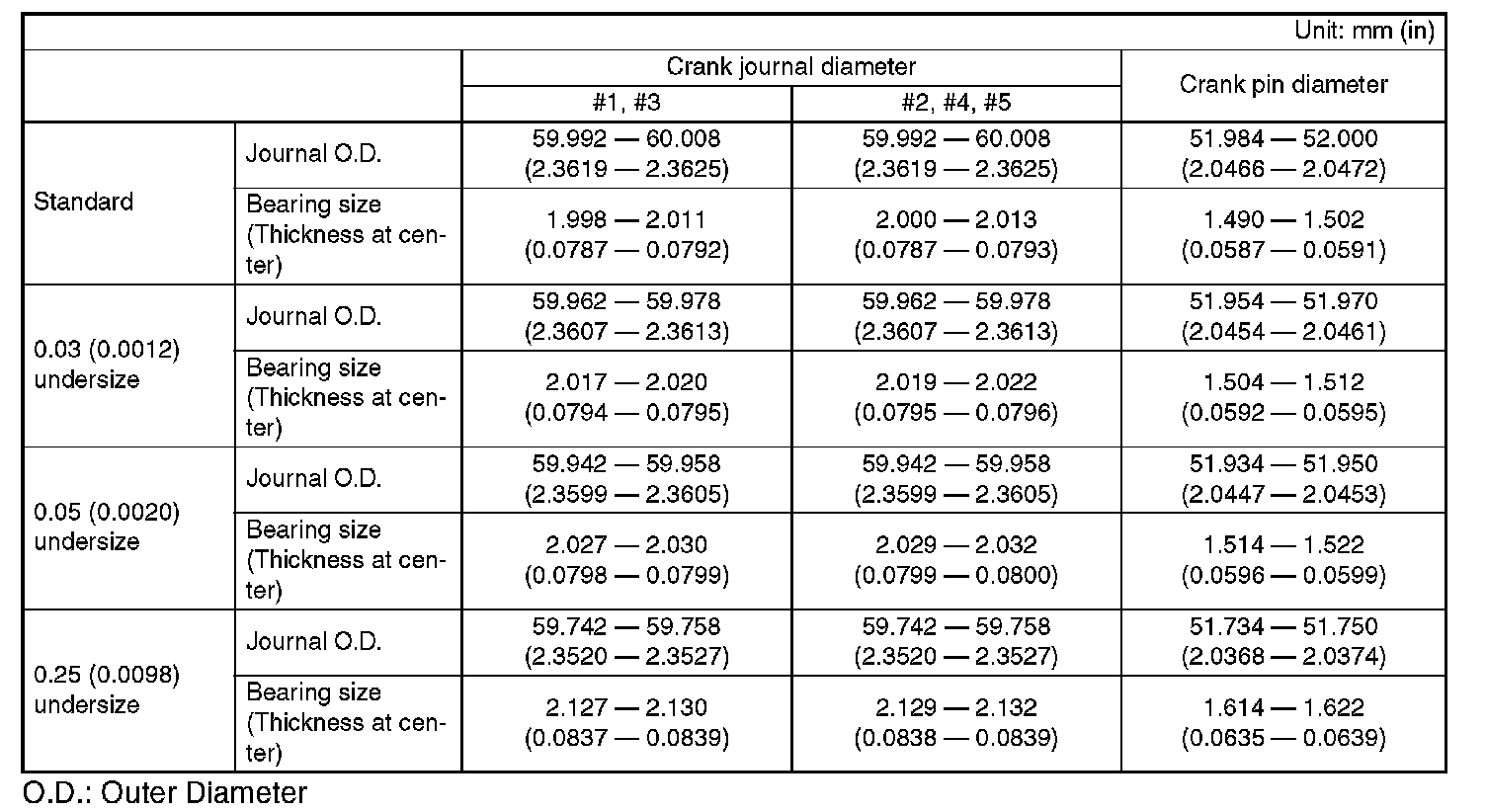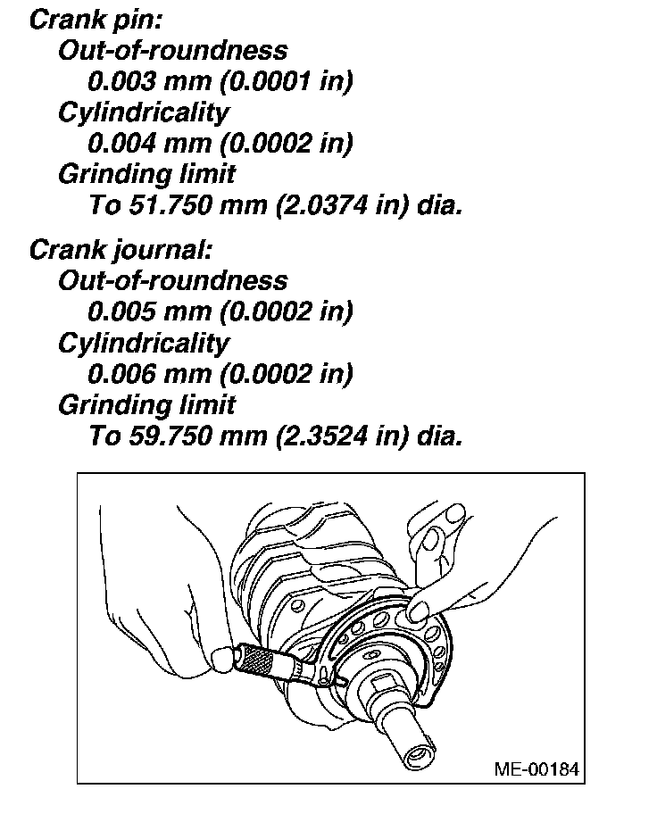 3. Inspect the crank journal and crank pin for wear. If they are not within the specifications, replace the bearing with a suitable (undersize) one, and then replace or recondition the crankshaft as necessary. When grinding the crank journal or crank pin, finish them to specified dimensions according to the undersize bearing to be used.