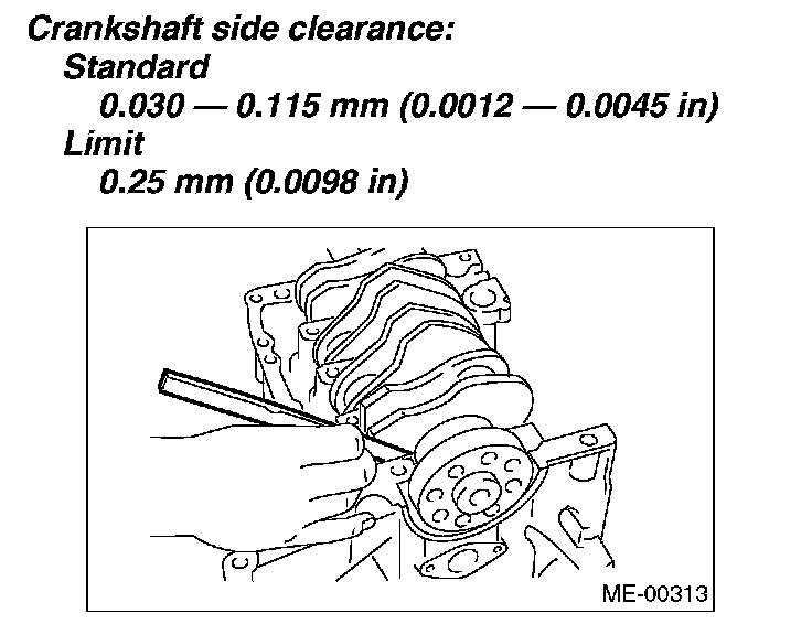 4. Measure the side clearance of crankshaft at center bearing. If the clearance exceeds the limit, replace the bearing.