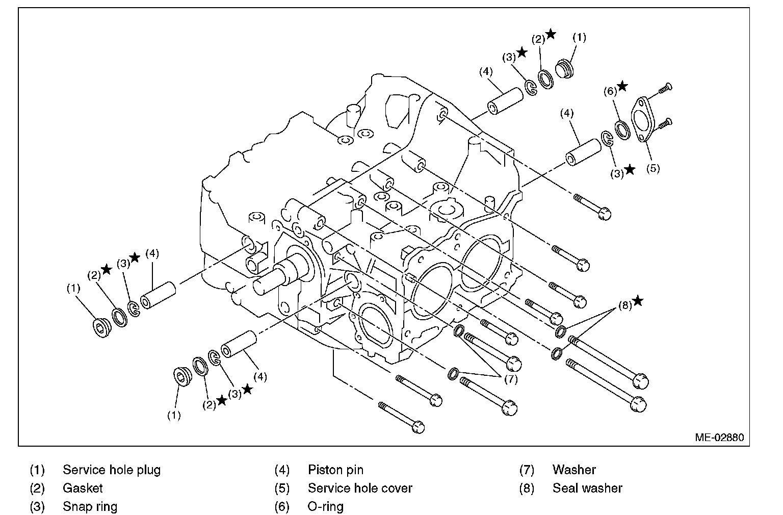 24. Rotate the crankshaft to bring #1 and #2 pistons to bottom dead center position, and then remove the piston snap ring through service hole of #1 and #2 cylinders.