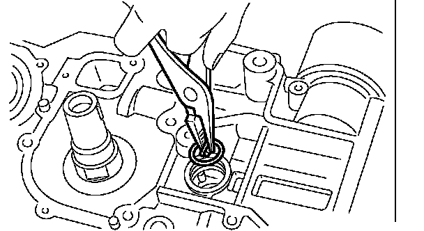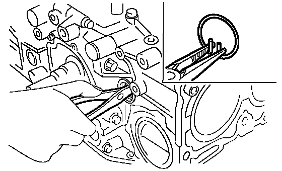 ^ Remove the oil pump from cylinder block. Use a flat tip screwdriver when removing the oil pump.
