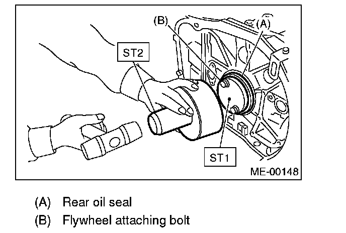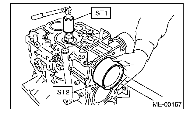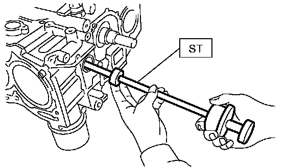 12. Apply engine oil to the outer perimeter of rear oil seal, and install the rear oil seal using ST1 and ST2.