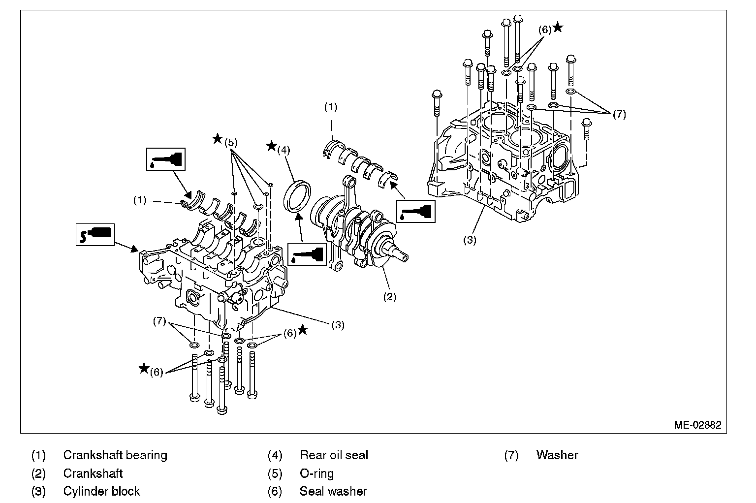 1. Remove oil in the mating surface of bearing and cylinder block before installation. Also apply engine oil to crankshaft pins.
