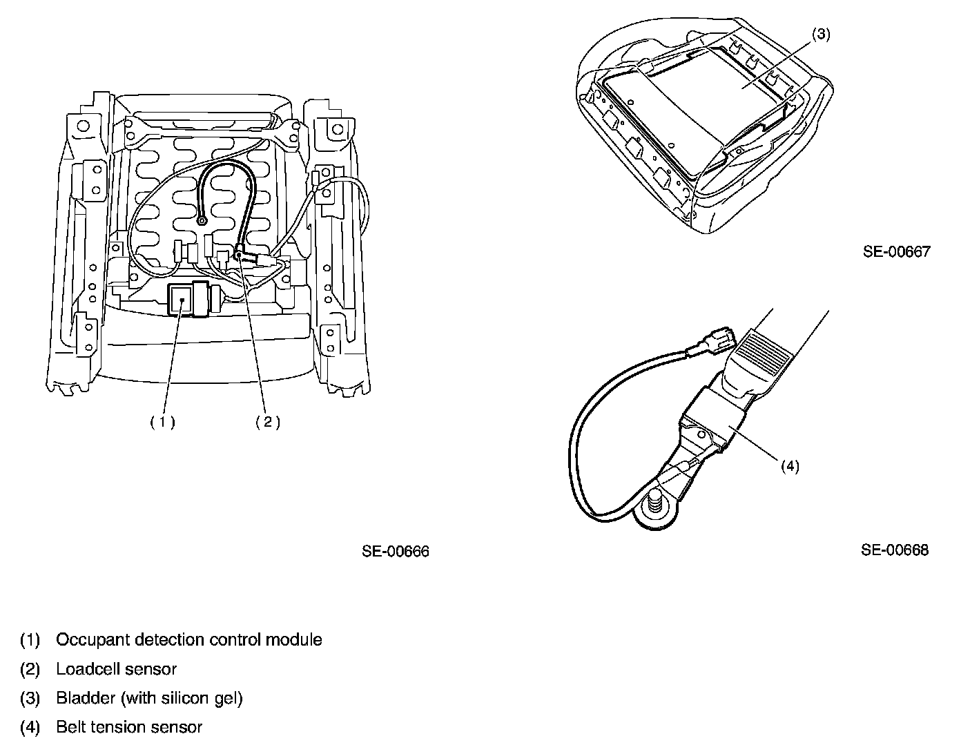 In '06MY, the occupant detection system was changed. The loadcell sensor that is located between the seat cushion and the seat frame consists of the bladder (bag) containing silicon gel and the pressure sensor connected with a hose. When the passenger sits in the passenger's seat, the silicon gel contained in the bladder is pushed. The loadcell sensor measures this pressure, and then it sends the signal to the occupant detection control module. The occupant detection control module detects the physique of the person sitting in the passenger's seat based on the signals, and then it sends the control signal to the airbag control module.