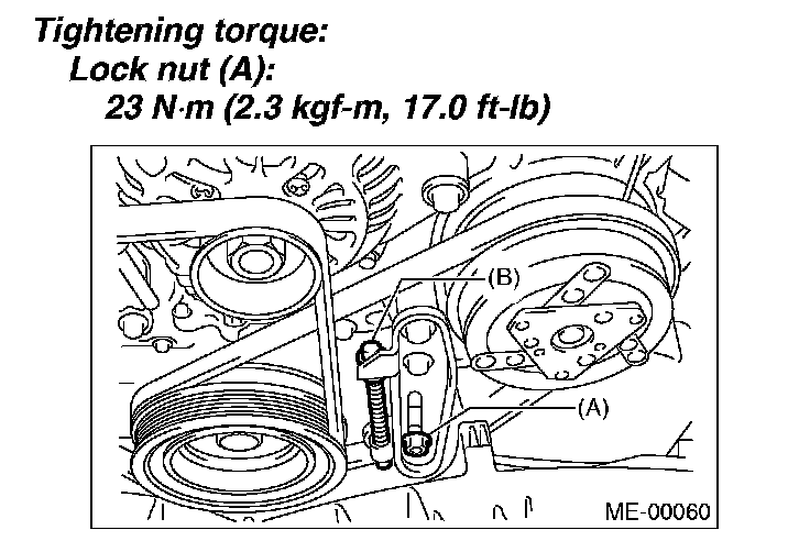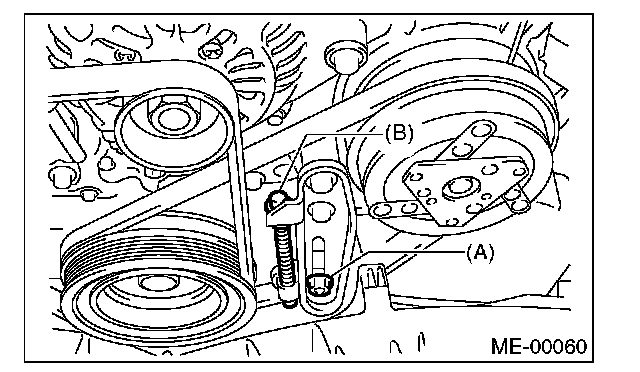 1. Install the belt, and tighten the slider bolt (B) so as to obtain the specified belt tension.