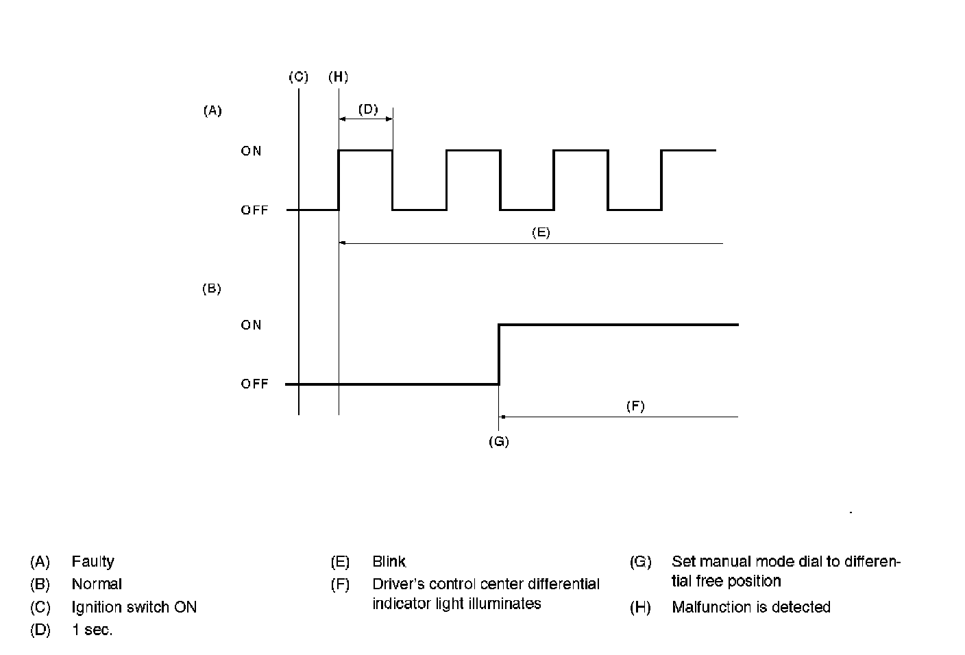 INSPECTIONWhen the malfunction occurs on part or unit, the control module performs self diagnosis and driver's control center differential indicator light (at the bottom differential free light) keep blinking until detect the malfunction and the ignition switch is turned to OFF. Faulty part or unit can be identified by calling up DTC. Indicator display is as shown in the figure.