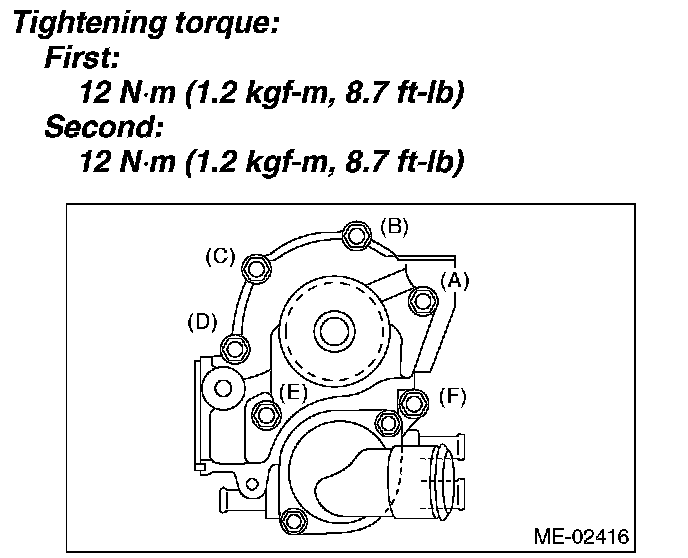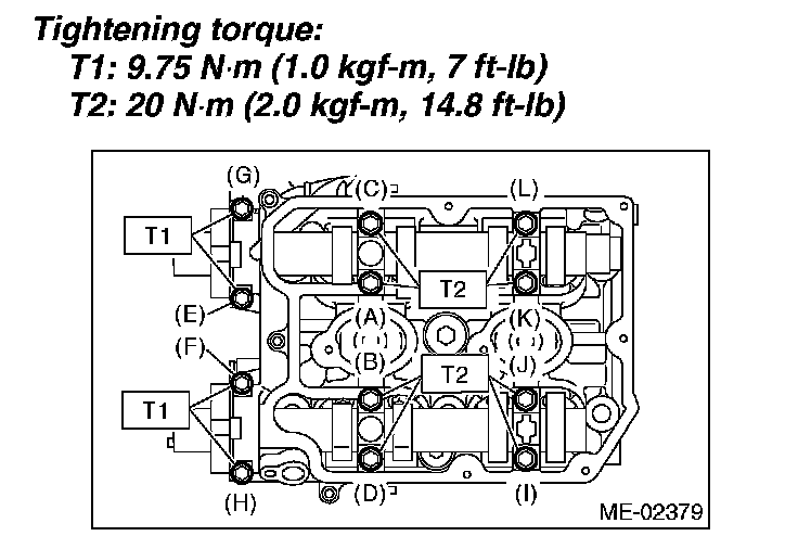 2. Tighten all bolts to 29 Nm (3.0 kgf-m, 21.4 ft. lbs.) in alphabetical sequence.