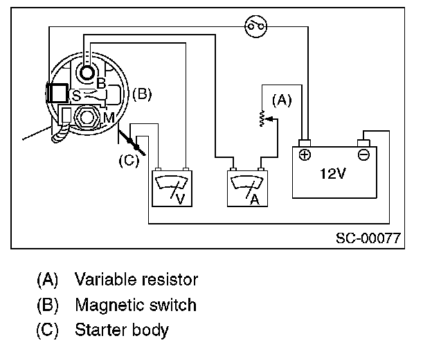 With switch on, adjust the variable resistor to obtain 11 V, take the ammeter reading, and then measure the starter speed. Compare these values with the specifications.