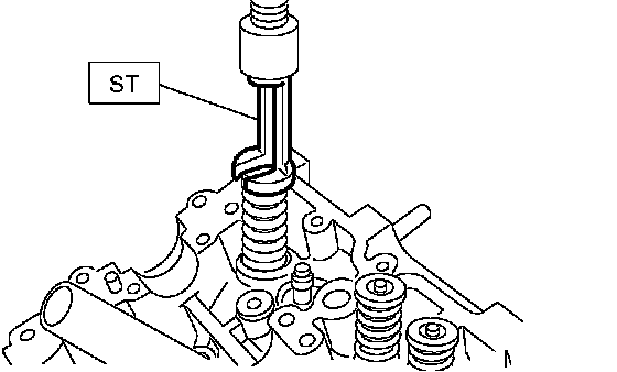 2. Set the ST on valve spring. Compress the valve spring and remove the valve spring retainer key. Remove each valve and valve spring.