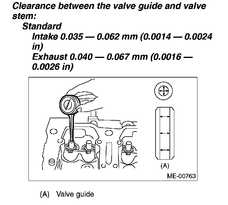 2. If the clearance between valve guide and stem exceeds the standard value, replace the valve guide or valve itself whichever shows greater amount of wear. See the following procedure for valve guide replacement.