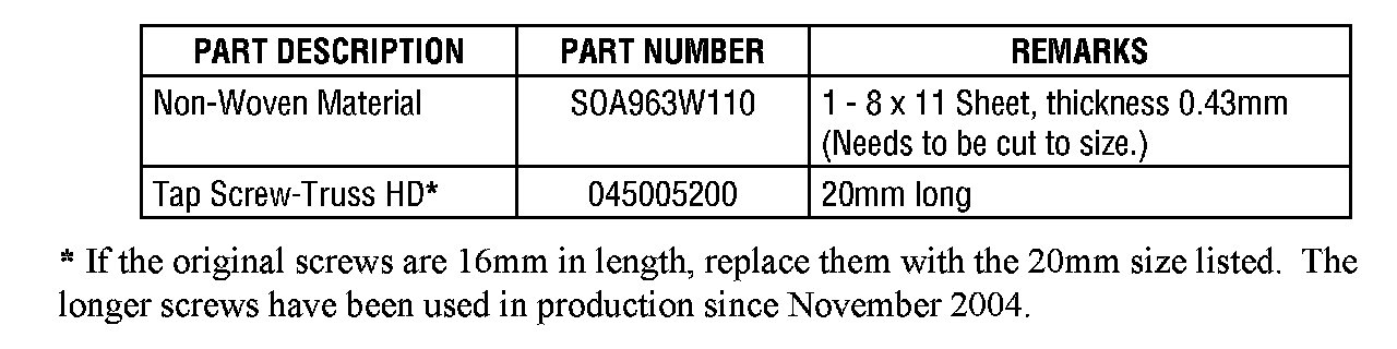 Parts: Use part # S0A635079 for the non-woven material. The part # is non-orderable and used for claim purposes only.