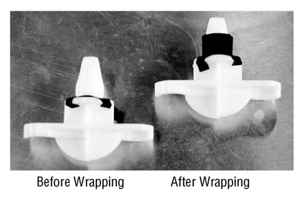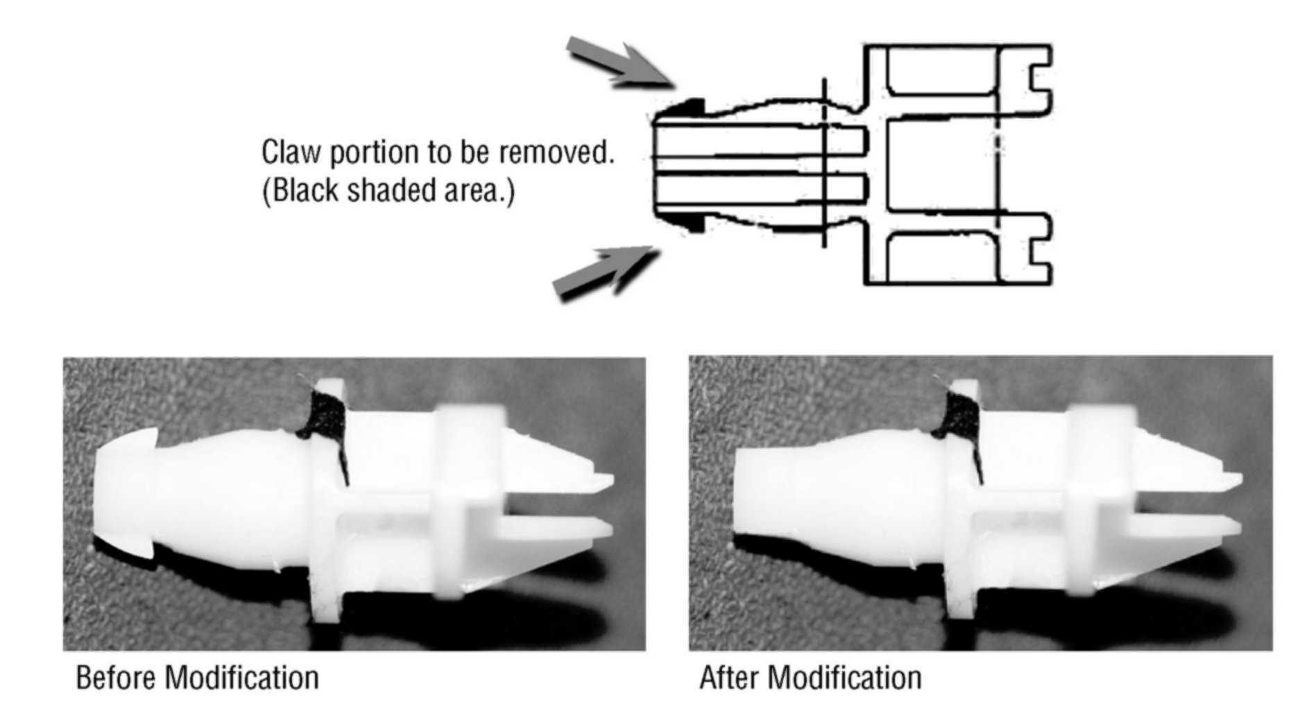 8) Carefully remove the 2 smaller claws of the grommet. A utility knife, file or die grinder may be used. We suggest a die grinder. Make sure to wear safety glasses. If using a utility knife be extremely careful.