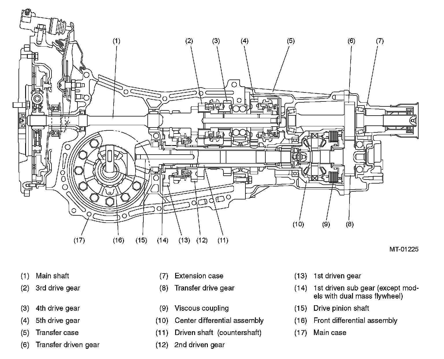 GeneralThe manual transmission is of a full-time all-wheel-drive design integrating a transmission assembly, front differential, and transfer gear assembly with center differential into a single unit. The transmission has five forward speeds and one reverse speed, and all gears are provided with inertia lock type synchronizers.