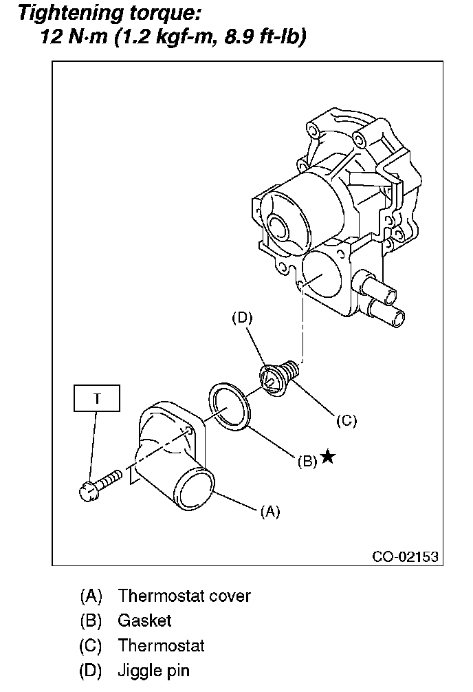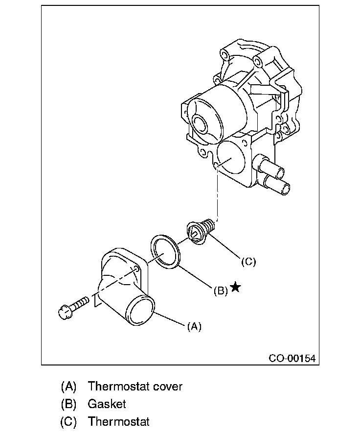 1. Install a gasket to thermostat, and install the thermostat and gasket to water pump as a unit. Then, install the thermostat cover.
