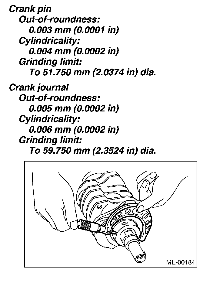 3. Inspect the crank journal and crank pin for wear. If they are not within the specification, replace the bearing with a suitable (undersize) one, and replace or readjust crankshaft as necessary. When grinding the crank journal or crank pin, finish them to the specified dimensions according to the undersize bearing to be used.