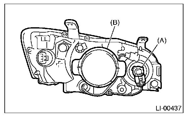 6. Remove the bulb assembly (A) to remove high beam. To remove the low beam, remove the back cover (B), and then go to Step 7.