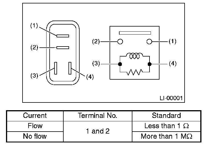 Measure the resistance between headlight relay terminals when connecting terminal No. 4 to battery positive terminal and terminal No. 3 to battery ground terminal.