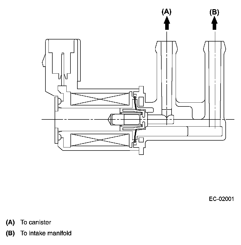 PURGE CONTROL SOLENOID VALVEThe purge control solenoid valve is on the evaporation line between the canister and intake manifold. The valve is installed under the intake manifold and lets the evaporative gas absorbed by the canister be drawn into the intake manifold.