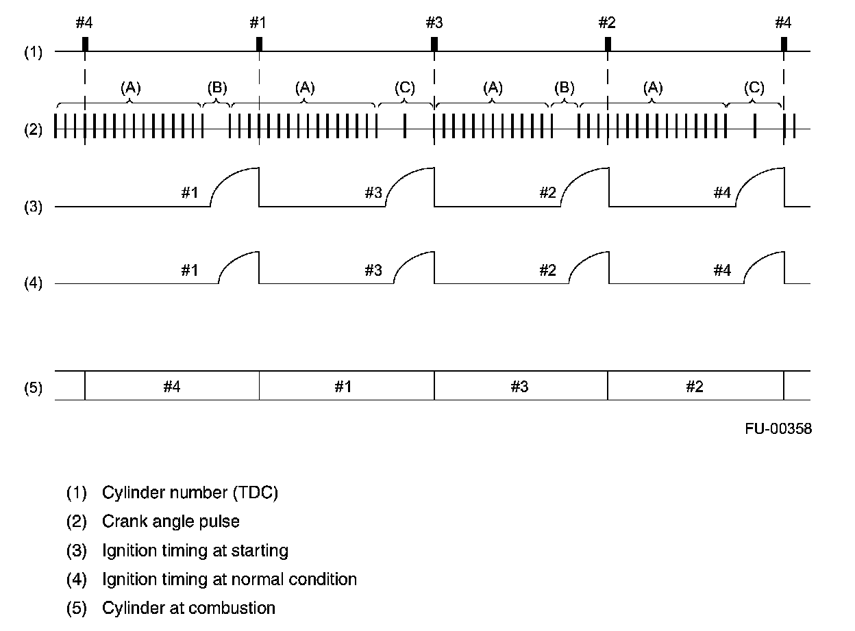 - The ECM judges that the No.1 and No.2 cylinders are at TDC when it detects the range (B), and that the No.3 and No.4 cylinders are at TDC when it detects the range (C).