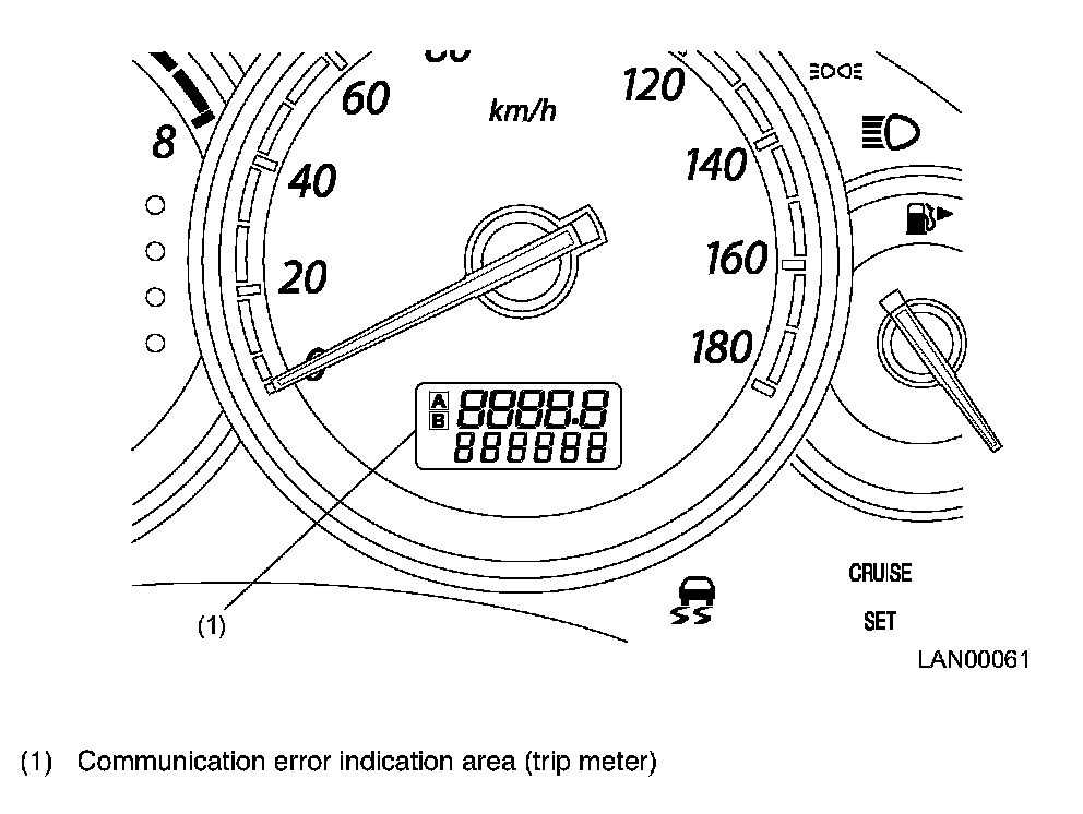 COMMUNICATION ERROR INDICATIONS- If a fault occurs in the body integrated unit or LAN system (in any unit or the communication circuit), a communication error indication is given at the trip information display area on the combination meter.