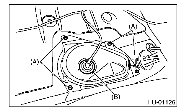 2. Push the grommet (B) down and remove the service hole cover.