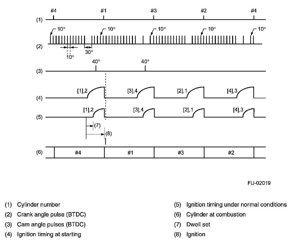 - Ignition control during start-up Engine speed fluctuates during start of the engine, so the ECM cannot control the ignition timing. During that period, the ignition timing is fixed at 10 degrees BTDC by using the 10 degrees signal from the crankshaft position sensor.