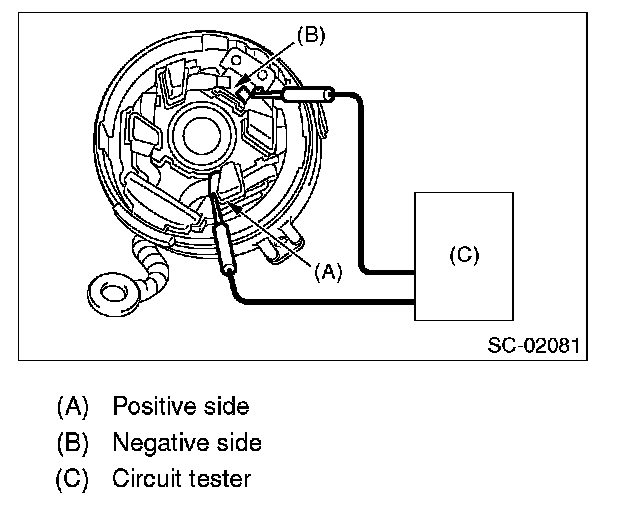 Using a circuit tester, touch one probe to positive side brush holder and the other to negative side brush holder. There should be no continuity.