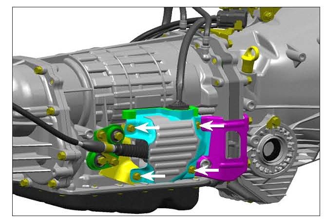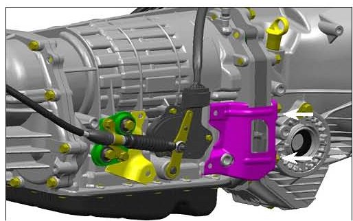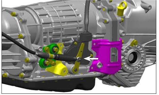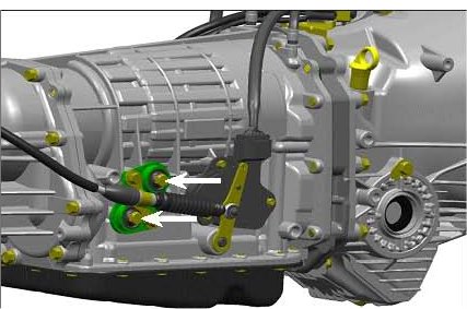 5) Install the select cable to the AT Cable Plate Assembly using the AT Cable Bracket with the 2 bolts that were retained. Install the AT Cable Plate Assembly, Cable and Bracket to the transmission using the 2 bolts that were retained.