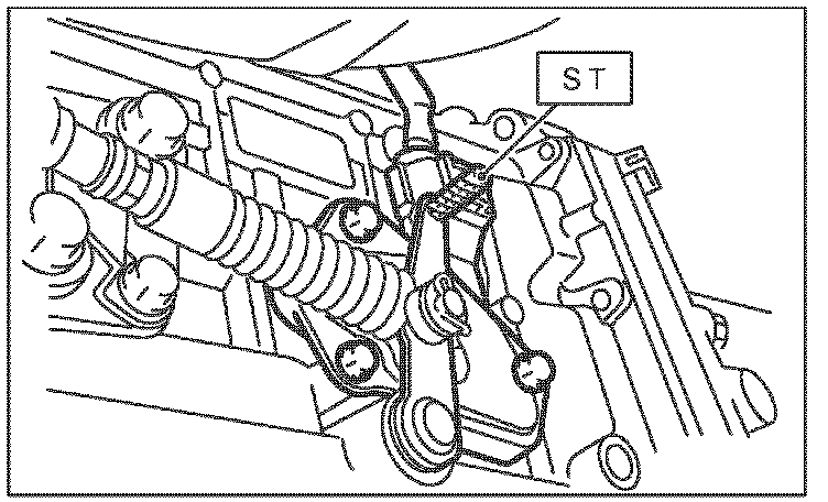 ^ Insert ST (special tool) 499267300 Stopper Pin as vertical as possible into the holes in the inhibitor switch lever and switch body.