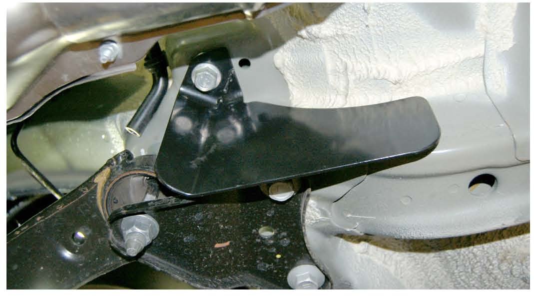 2) Install splash fin using flange bolt, make sure fin runs parallel with frame rail, torque bolt to 140 +/- 20 Nm (14.2 +/- 2.0 kgf-m, 103 +/- 14.7 ft-lb)