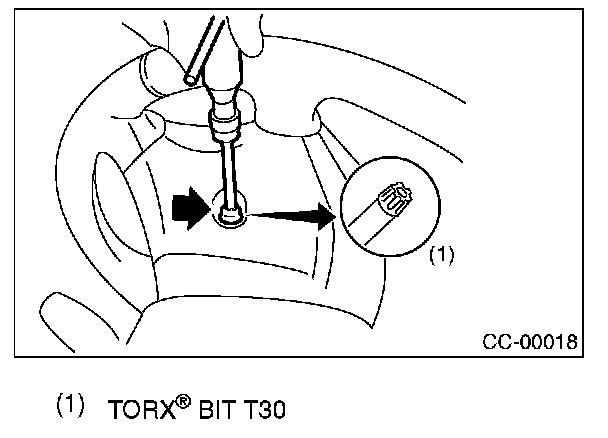 4. Using TORX(R) BIT T30 (Tamper resistant type), loosen the two TORX(R) bolts which secure driver's airbag module.