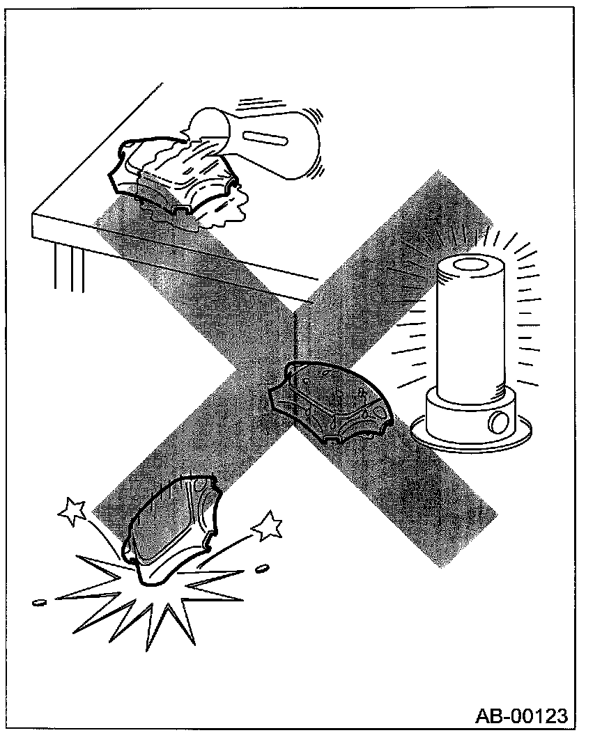 - When storing a removed airbag module, do not place any objects on it or pile airbag modules on top of each other. If the airbag inflates for some reason when it is placed with its pad side facing downward or under any object, a serious accident may result.