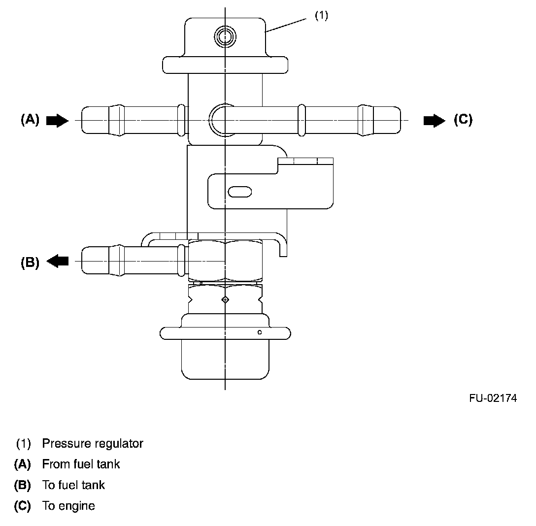 PRESSURE REGULATORThe pressure regulator is installed at the injector end of the fuel supply line. It has a fuel chamber and spring chamber separated by a diaphragm. The fuel chamber is connected to the fuel supply line and the spring chamber is connected to the intake manifold. Fuel chamber also has a relief valve connected to the fuel return line through which fuel returns to the fuel tank. When the intake manifold vacuum increases, the diaphragm is pulled and the relief valve opens to decrease the fuel supply line pressure (or fuel injection pressure). When the intake manifold vacuum decreases, the diaphragm is pushed by the spring to increase the fuel supply line pressure. Thus, the difference between the fuel injection pressure and the intake manifold vacuum is kept at a constant level of 343 kPa (3.50 kgf/sq.cm , 49.7 psi) to precisely control the amount of injected fuel.
